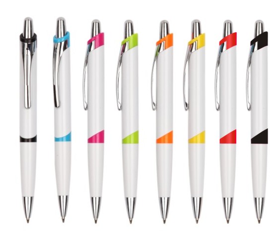 Solid white barrel, solid colored middle ring and top, metal clip, polished chrome plated trims.