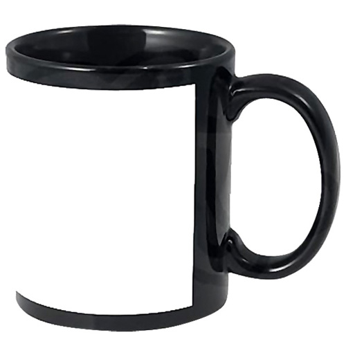 A high-gloss black 11oz coffee mug with a white printing area for sublimation wrap-around image.